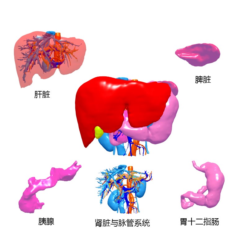CT或MRI数据经过处理形成3D结构,包括肝脏、胆道、胰腺、脾脏、肾脏、胃肠道及其相关血管。处理后的3D图像可以分解、旋转和透明化,3600观察器官、血管和病灶之间的关系。