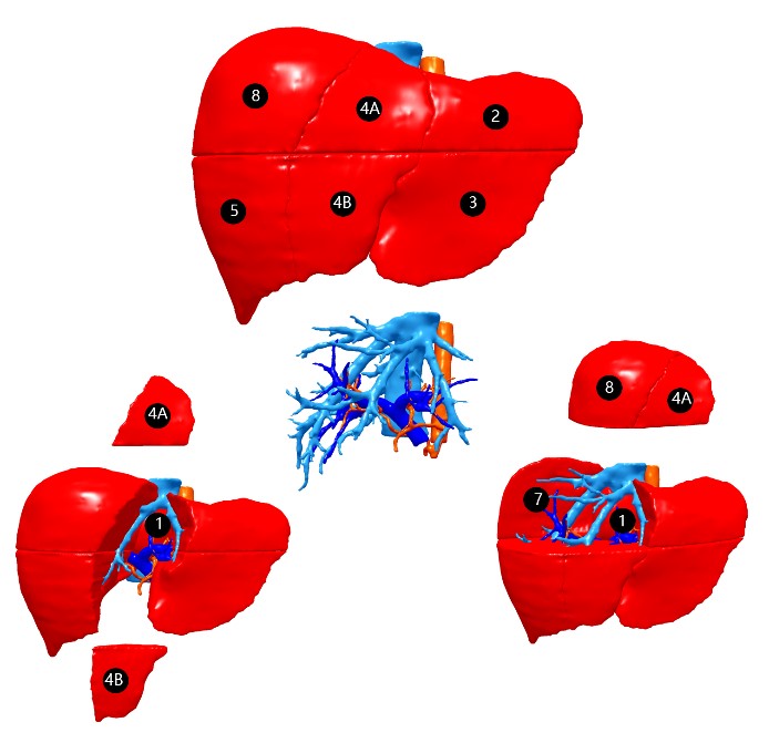 肝脏CT或MRI数据经过处理形成3D结构,包括肝动脉、门静脉、肝静脉、下腔静脉等。处理后的3D图像可以分解、旋转和透明化,3600观察肝脏内部血管与病灶之间的关系。