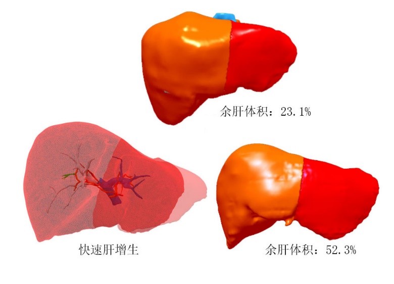 仿真门静脉压力计算 基于计算流体力学的门静脉压力仿真计算,通过B超测定门静脉压力,可仿真出门静脉压力,有利于患者术前规划的选择和预防术后肝功能衰竭。 快速肝增生(养肝)技术 余肝体积不足的患者,通过快速肝增生(养肝)技术—末梢门静脉栓塞联合肿瘤动脉栓塞,快速增大余肝体积,达到肝癌根治的目的。 余肝体积计算与肝切除方式的选择 肝切除后余肝体积对预防术后肝衰至关重要。在电脑上设计不同的手术方式,选择有利于患者的手术方式。